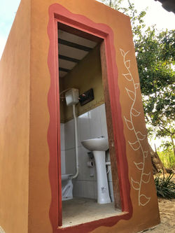 D. Eva foi uma quitandeira tradicional da comunidade de São Gonçalo do Rio das Pedras, em Serro/MG. Ela realizou o sonho de ter seu café no fundo do quintal e realizamos a pintura do banheiro, com uma vivência para produção e pintura com tinta de terra.